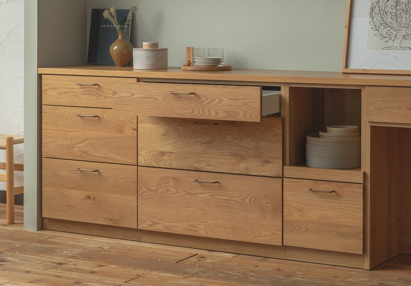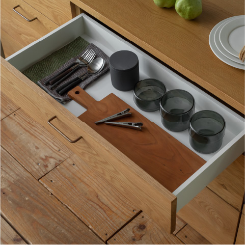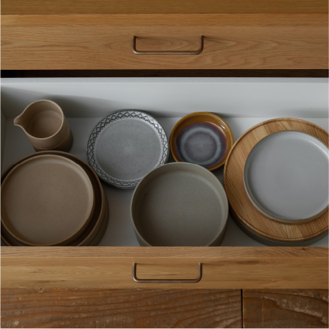 - 引き出しはフルオープンタイプなので、奥のスペースまで余すことなく収納可能。深型鍋も入る最下段の引き出しはさらに大容量です。