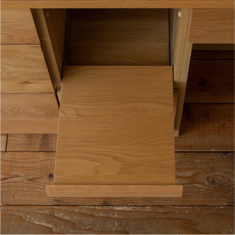 - 引き出しはソフトクローズのレールを採用。閉まる直前に減速して自動で収まるので強く押しても静かに閉まります。